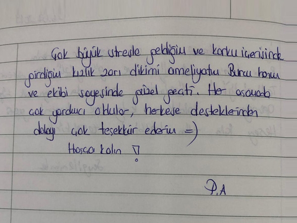 Çok büyük stresle geldiğim ve korku içerisinde girdiğim kızlık zarı dikimi ameliyatım Burcu hanım ve ekibi sayesinde güzel geçti. Her aşamada çok yardımcı oldular, herkese desteklerinden dolayı çok teşekkür ederim.