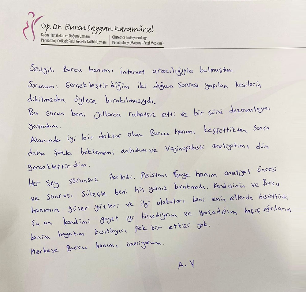 Sevgili Burcu hanımı internetten aracılığı ile bulmuştum. Sorunum: gerçeleştirdiğim iki doğum sonrası yapılan kesilerin dikilmeden öylece bırakılmasıydı. Bu sorun beni yıllarca rahatsız etti ve bir sürü dezavantajını yaşadım. Alanında iyi bir doktor olan Burcu hanımı keşfettikten sonra daha fazla beklememin anlamı yoktu. Vajinoplati ameliyatı dün yaptı. Herşey sorunsuz ilerledi. Asistanı Gate hanım ameliyat öncesi ve sonrası süreçte beni hiç yalnız bırakmadı. Kendisinin ve Burcu hanımın güleryüzü ve ilgi alakaları beni emin ellerde hissettirdi. Kendimi gayet iyi hissediyorum hafif ağrılarım var sadece ama hayatımı kısıtlayıcı pek bir etkisi yok. Herkese Burcu hanımı öneriyorum.